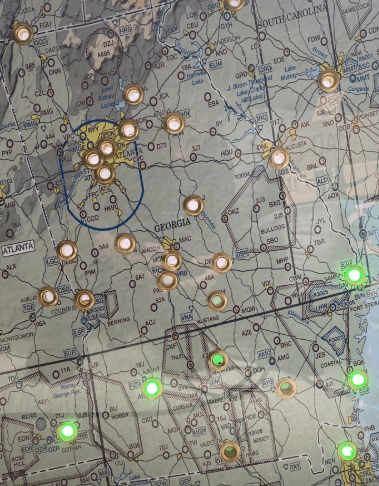 Another technique is to mount the LED on the back of the map and let it shine through the map without drilling any holes. The issue with some of those seen online, is the light can be quite diffused and wide-spread. If 2 airports are close, the light overlaps. Again, by designing and printing a 3D mount for the LED, the mount creates a defined circle of light that is seen from the front. Also, the mount secures the LED horizontally to the map maximizing the length of wire between airports.